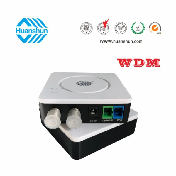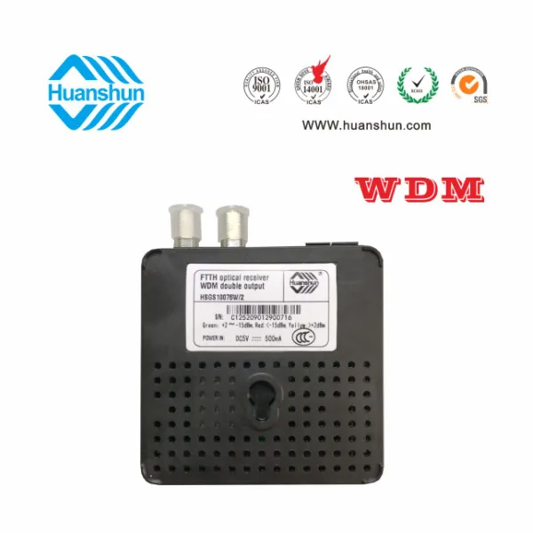 WDM型雙輸出光接收機(jī) | HSGS10076W/2 | CATV 1540~1565nm接收,-5~-15dBm/RF 2×72dBuv恒流輸出,PON:1490/1310nm;外接90~255V 5V 0.5A電源適配器 |